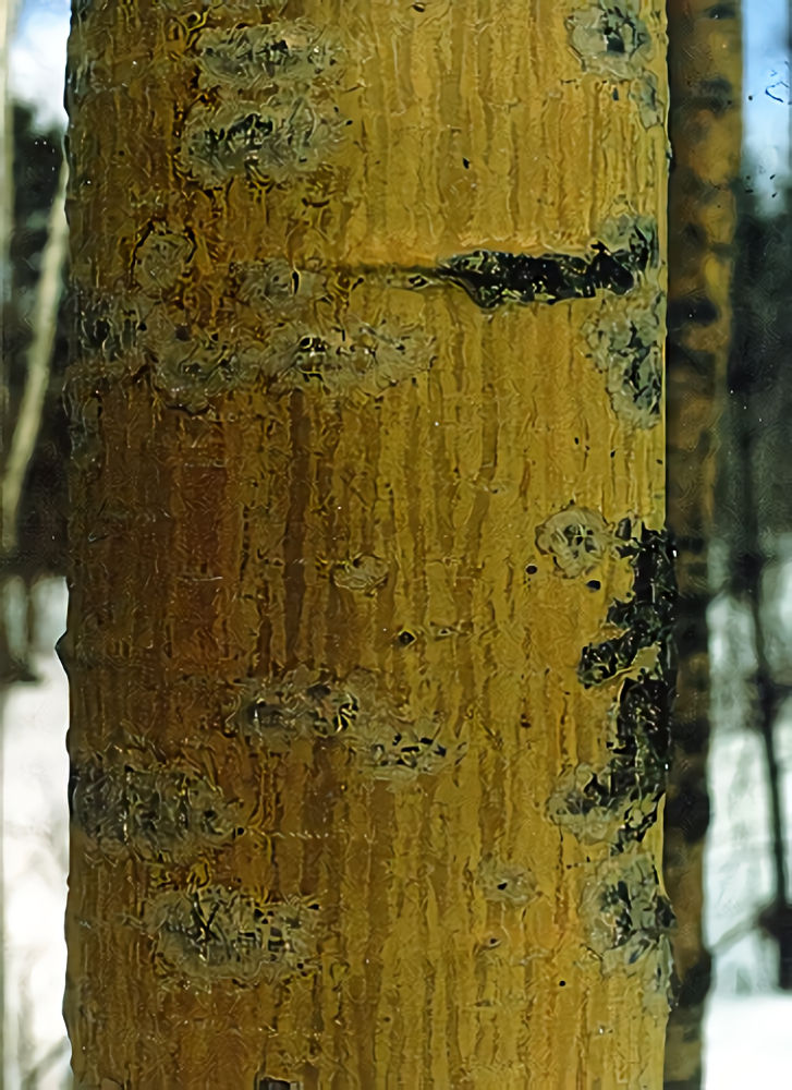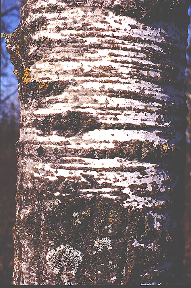 Observing bark differences is the easiest way to distinguish the two aspens, as well as their family cousins.  Quaking aspen has gray to white bark, broken-up with horizontal patterns of black.  There are light and dark variations in the bark.  Bigtooth aspens generally have an olive-colored cast to the bark.  Larger trees of both species lose their smooth texture in favor of a fissured bark texture.